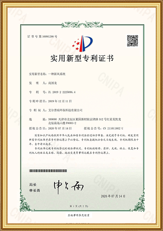 實用新型專利證書(一種新風(fēng)系統(tǒng))